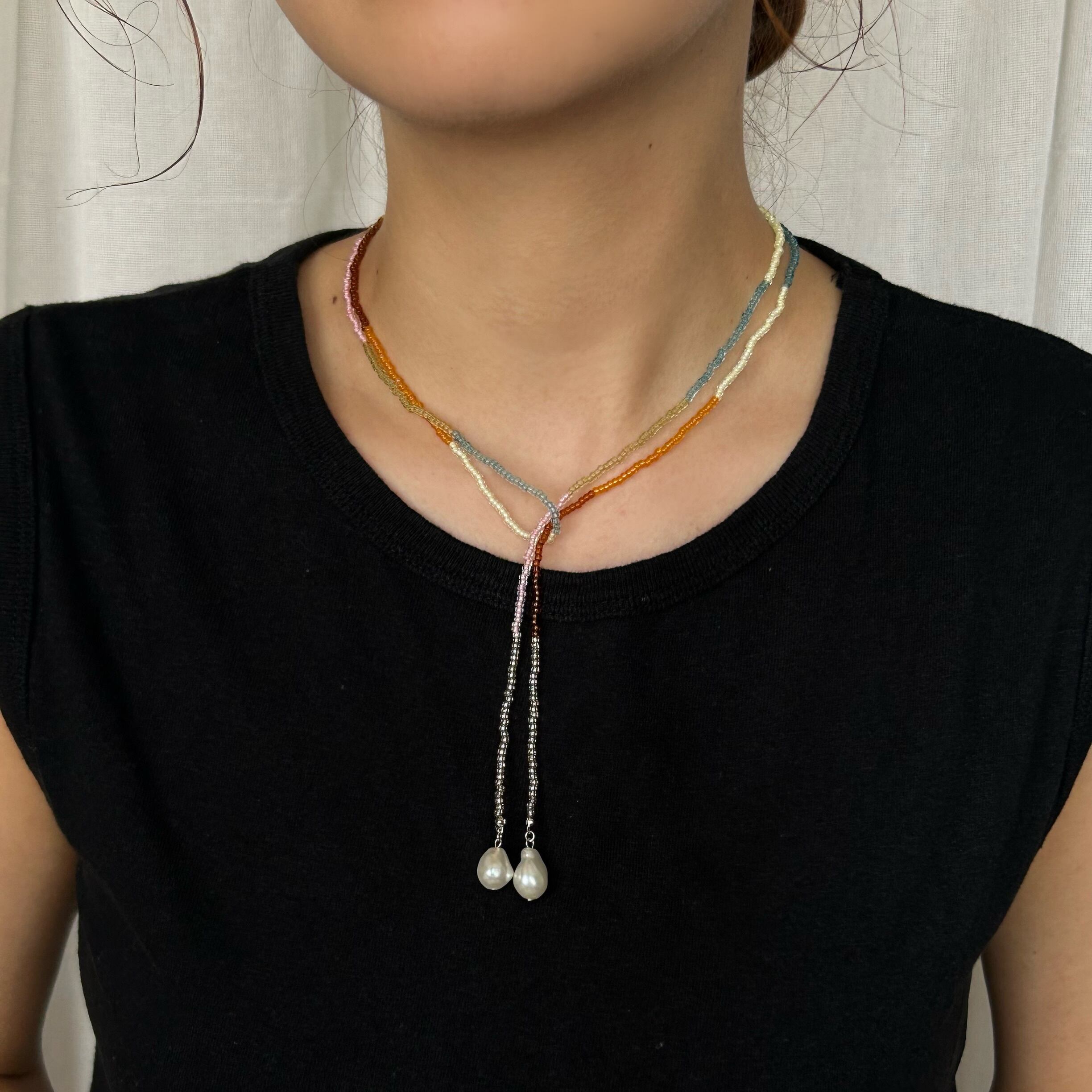 違う色味のビーズネックレスやシルバー/ゴールドのチェーンとも相性が良いので重ねづけもおすすめです。
